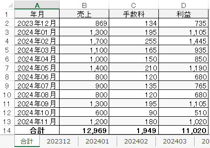 集計結果は下記のように合計および指定年月ごとに出力されます。